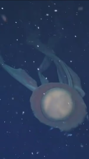 ROV’un ışıkları altında adeta dans edercesine ilerleyen hayalet denizanası, dört uzun “ağız kolu” ile avını tuzağa düşürmek için hazırlandığı görüntülerde yer alıyor. Genellikle alacakaranlık kuşağında yaşayan bu canlı, 10 metreyi aşan kollarıyla derin denizlerdeki en büyük omurgasız yırtıcılardan biri olarak kabul ediliyor.