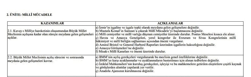 İnkılap Tarihi ve Atatürkçülük dersi kazanımlarının birinci ünitesinde öğrencilerden, Atatürk’ün I. Dünya Savaşı’na kadarki eğitim ve öğrencilik hayatıyla Osmanlı’nın siyasi, askeri ve sosyal açıdan durumunu analiz etmesi bekleniyor. Skandal olay, “Milli Mücadele” başlıklı ikinci ünitede ortaya çıktı. “YKS 2026’ya girecek aday öğrenciler, Büyük Millet Meclisi’nin (BMM) açılış süreci ve sonrasındaki olayları kavrar” ifadesi yer aldı. 581 sayfalık raporda, BMM ifadesi kullanılırken, “Türkiye” kelimesinin silindiği görüldü.