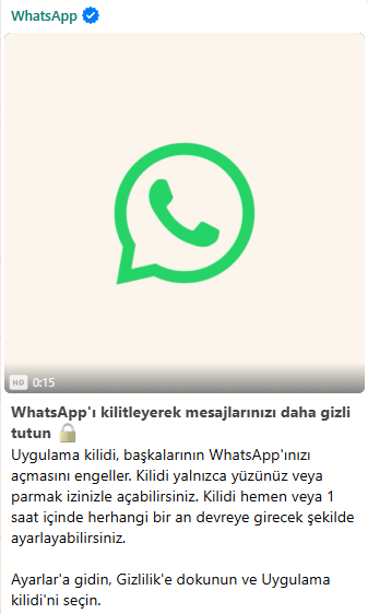 WhatsApp tarafından yapılan bilgilendirme mesajına göre, uygulama kilidi kullanıcılarına mesaj göndererek aktifleştirildiğinde bildirimde bulunacak. Bu yeni özellik sayesinde, telefonu başkalarının eline geçen kullanıcıların WhatsApp mesajlarına izinsiz erişiminin önüne geçilmesi hedefleniyor.